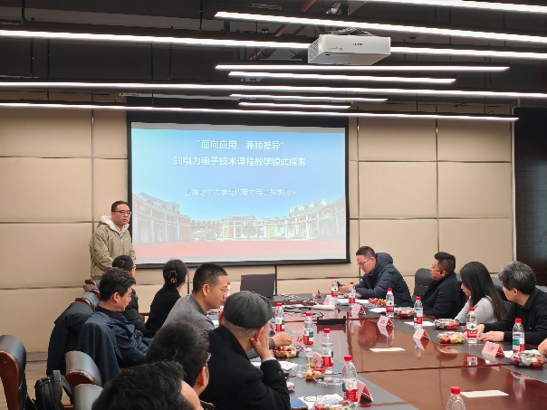 本次会议设置专题教学论坛与赛事交流两大核心板块,内容紧扣教学一线需求,干货满满、务实高效。在“沪上电力电子技术发展与教学论坛”环节,多位业内骨干教师依次作专题分享:王汉卿老师代表我系电力电子课程团队,聚焦课程建设核心痛点,分享了专业在理论课程建设、创新性课程设计、综合性项目制实践等系列课程优化与教学提升的实践思考,并介绍了近年来胡波、钱挺等教师带领下在学科竞赛中所取得的优异成绩;王勇老师围绕电力电子十四五规划教材建设,详解教材编写思路、内容迭代与育人适配性;杨迪瑞老师分享了“面向应用、兼顾差异”的电力电子技术课程教学模式,立足新工科人才培养要求,探索理论与实践融合的教学新路径;杨影老师则针对《电力拖动控制系统》教材修订与课程建设,分享实操经验与改进方向;最后,康劲松老师分享了结合同济大学在电动汽车、轨道交通领域的学科特长,从交通-能源融合的角度建设电力电子课程的经验。